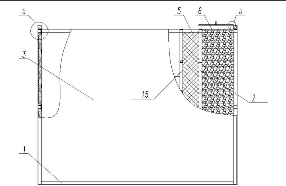 部設有除霧層和除沫層,液體在經過除霧層和除沫層后能夠將液體中的霧氣和氣泡去除,所述除沫層設于除霧層的左側,所述除沫層內部設有絲網除沫器7,所述除霧層內部包括板式除霧器5和除霧球6,所述板式除霧器5設于除霧球6的左側,除霧球6與板式除霧器5之間設有隔離板一2,絲網除沫層5和除霧球6通過不同程度的除霧將液體中的霧氣去除,所述絲網除沫器7設于板式除霧器5的左側,板式除霧器5和絲網除沫器7之間設有隔離板二15,所述噴淋段上殼體3的頂部設有通過螺栓組件4固定連接的兩塊除霧球封板9,除霧球封板9能夠防止在除霧過程中霧氣或者液體泄漏。值得注意的是,所述噴淋段上殼體3的四邊上設有等邊角鋼1,所述等邊角鋼1上設有安裝孔8,用于組件的固定和安裝。