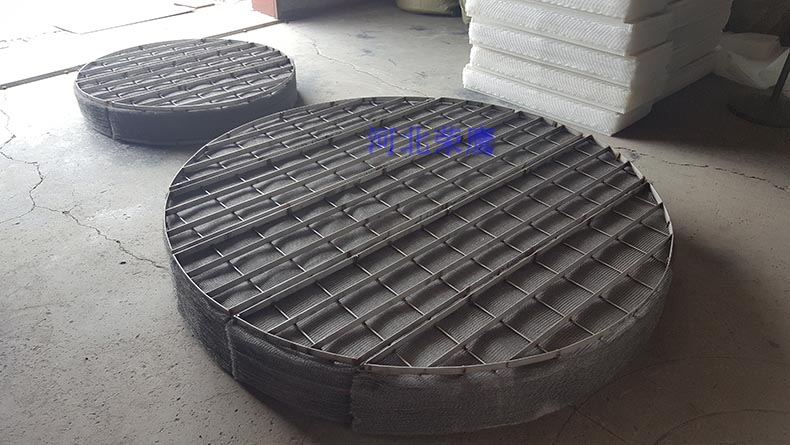 根據介質粘度的不同和液沫脫除要求的不同 ,絲網除沫器一般采用線徑為 0.25 ~ 0.30 mm 的合金絲,線間距約為 6 mm,編織成圓筒狀 ,再把它展平成寬度為 300 ~ 450 mm的帶狀絲網, 用數塊或數十塊網板重疊 ,捆以金屬絲 ,置于容器內格架上, 氣流自下而上通過絲網層 。絲網除沫器型式上分類:SP型(標準型)絲網除沫器、DP型(高效型)絲網除沫器,HP型(高穿透型)絲網除沫器。